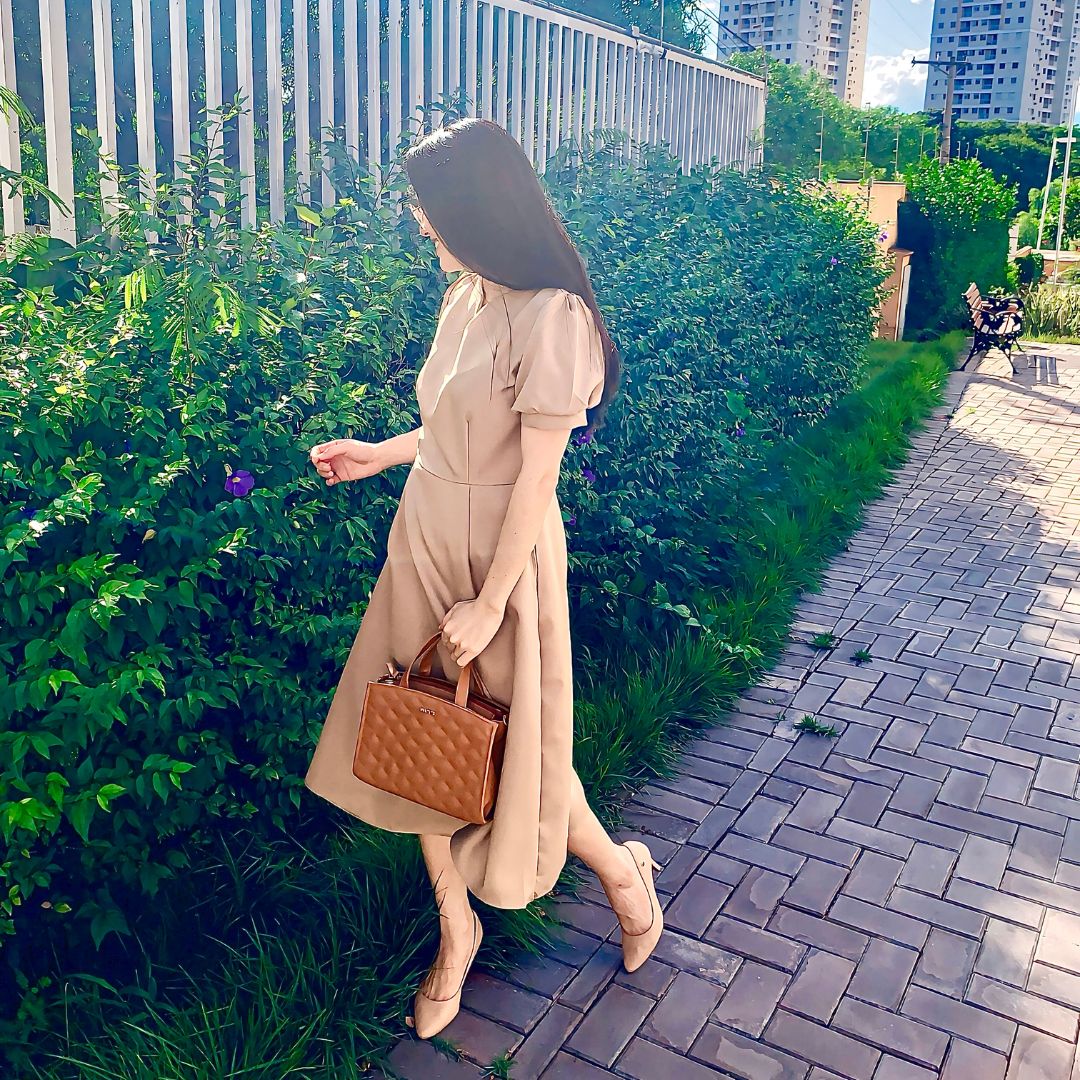 Possui bolsos laterais, zíper nas costas, mangas levemente bufantes, um caimento incrível, tamanho midi, corte evasê.