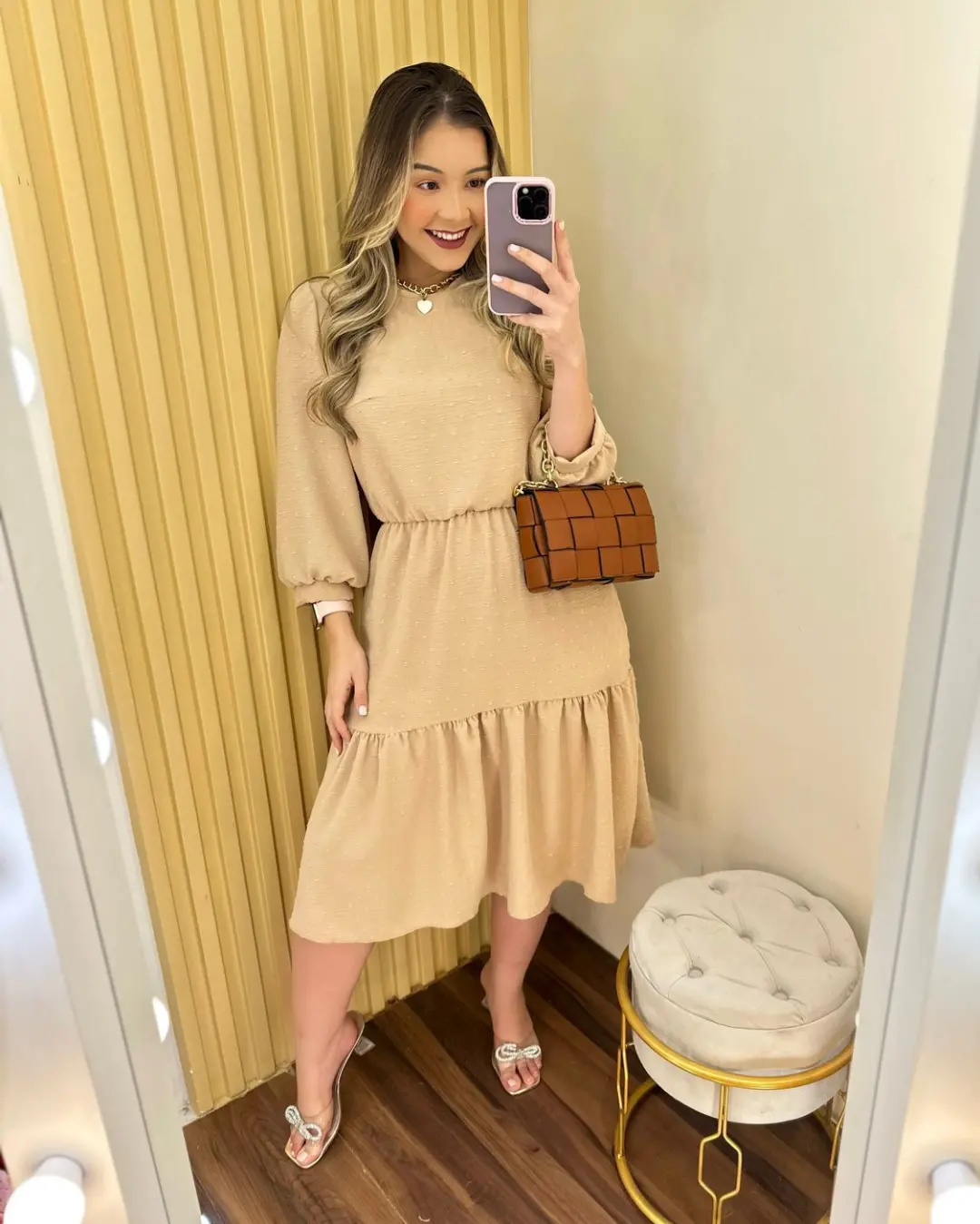 Um vestido encantador, delicado, possui botão que fecha a gola, manga semi longa, elástico na cintura e saia com babado.